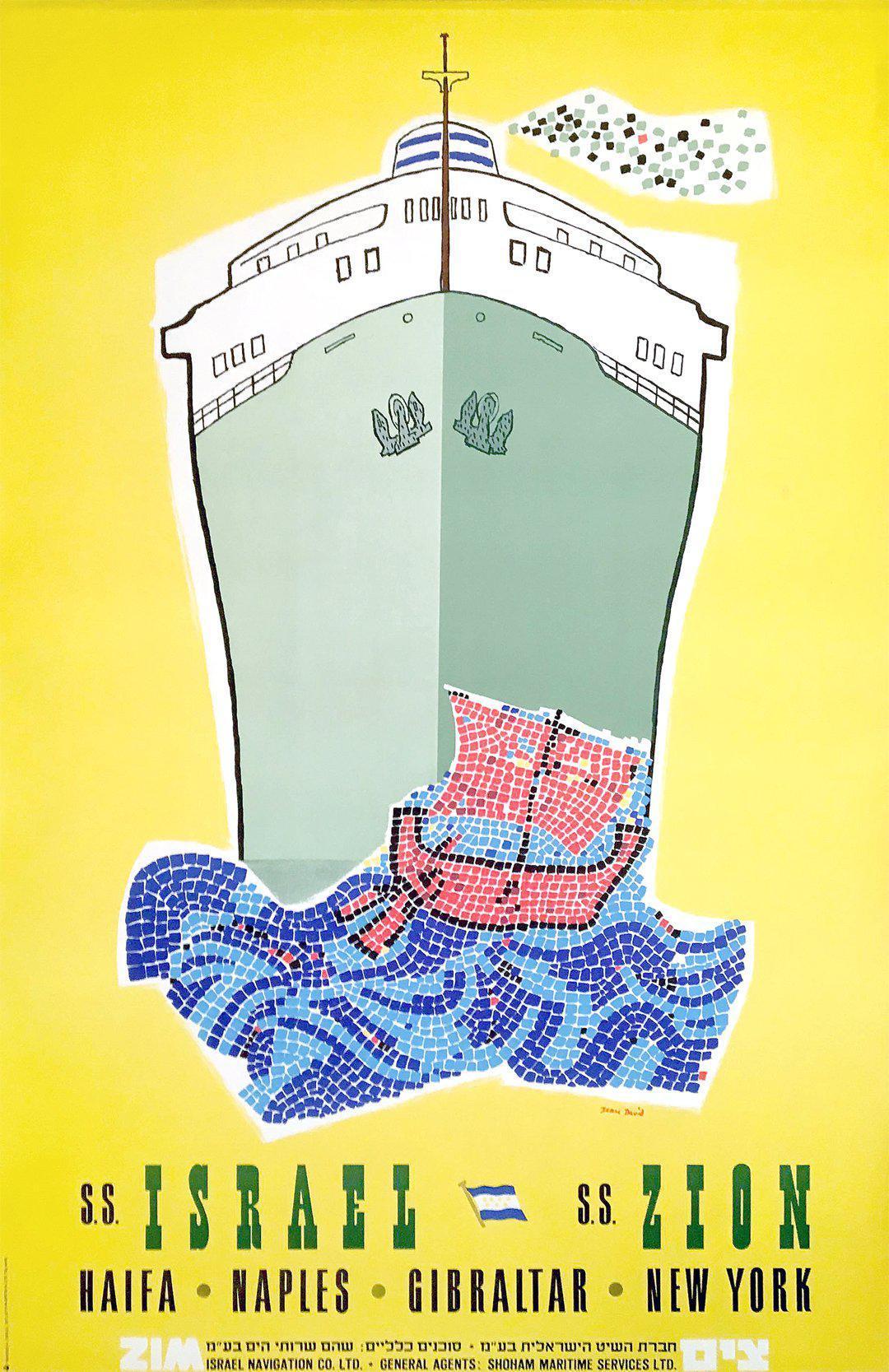 ZIM Shipping Lines is today one of the top 20 shipping companies in the world and it is based in Israel. It’s origins were in the 1940’s just prior to the establishment of the State of Israel in 1948. The boats were initially used to transport new immigrants to the growing State of Israel. In the 1950’s ZIM acquired more vessels that were used for passengers as well as transporting cargo. In this image we see the newly named SS Israel and the SS Zion with the mention of their destinations, including New York.
